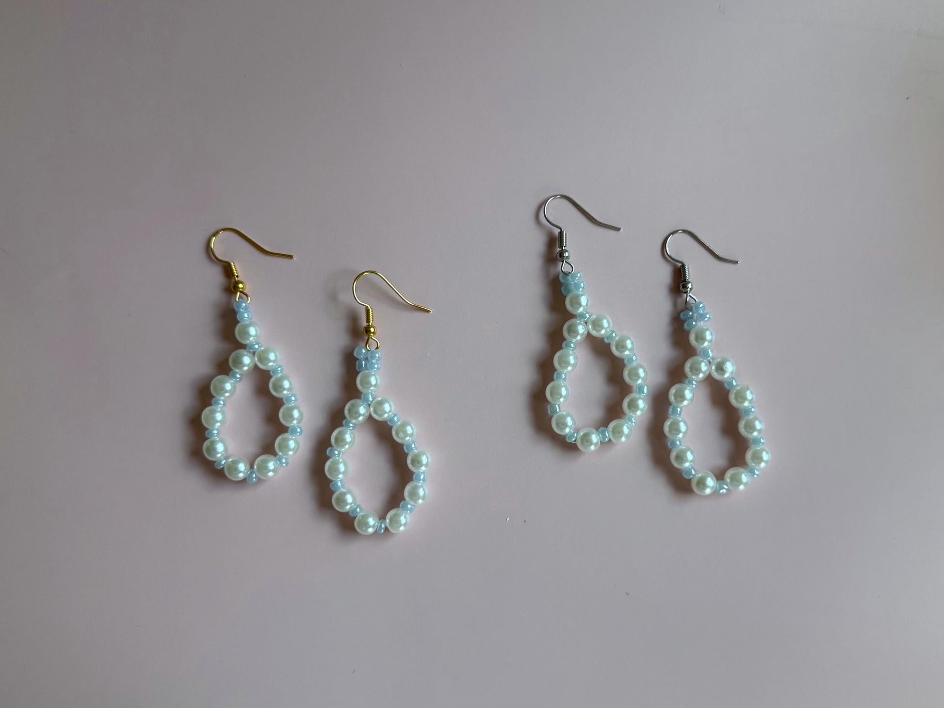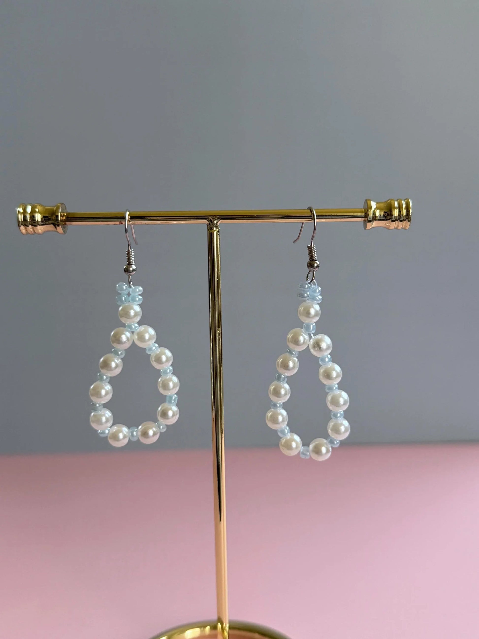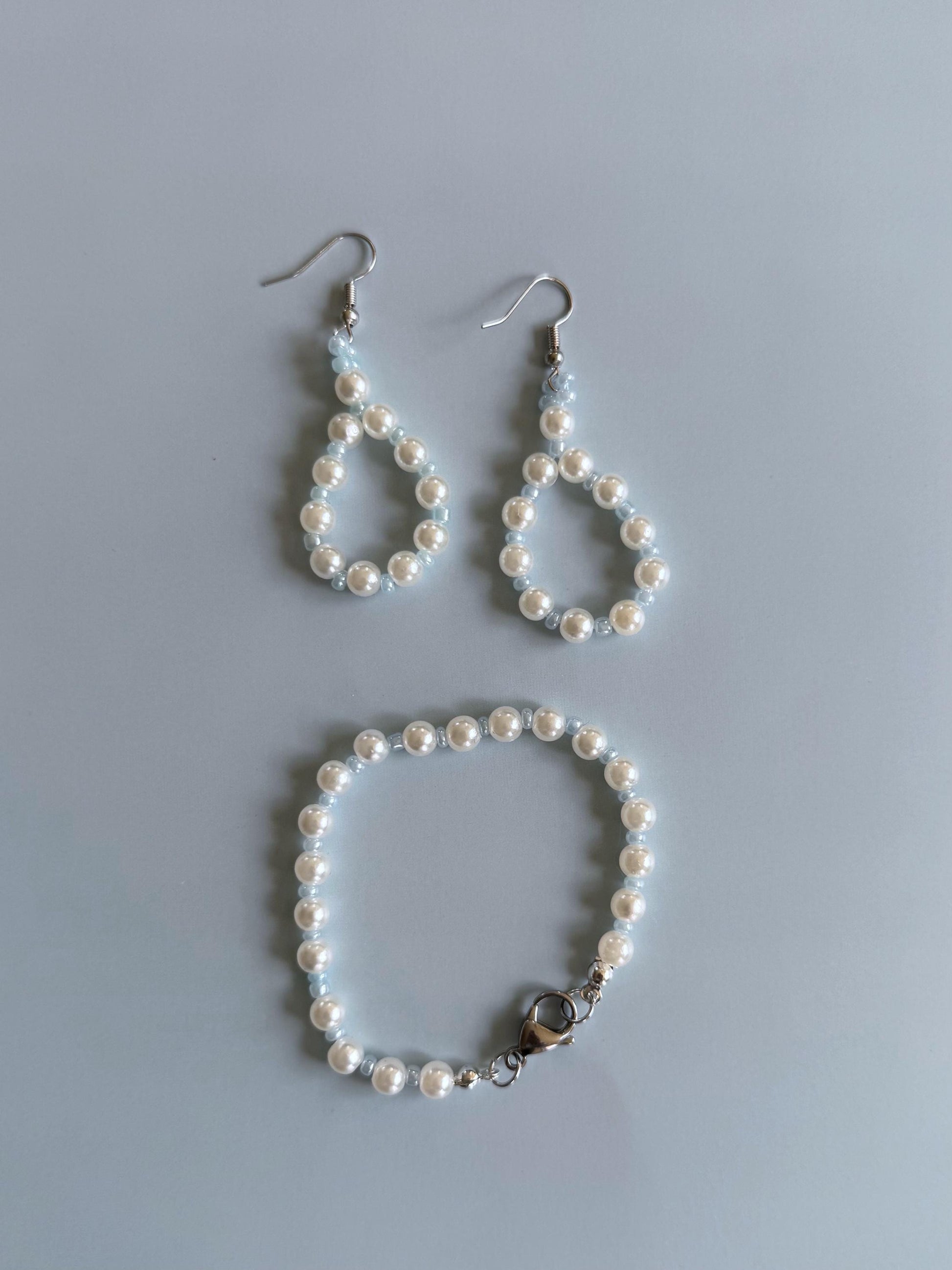 Blue and Pearl Jewelry Set | Handmade Loop Earrings & Matching Bracelet | Dainty Beaded Gift for Her | Kawaii Aesthetic Minimalist Jewelry